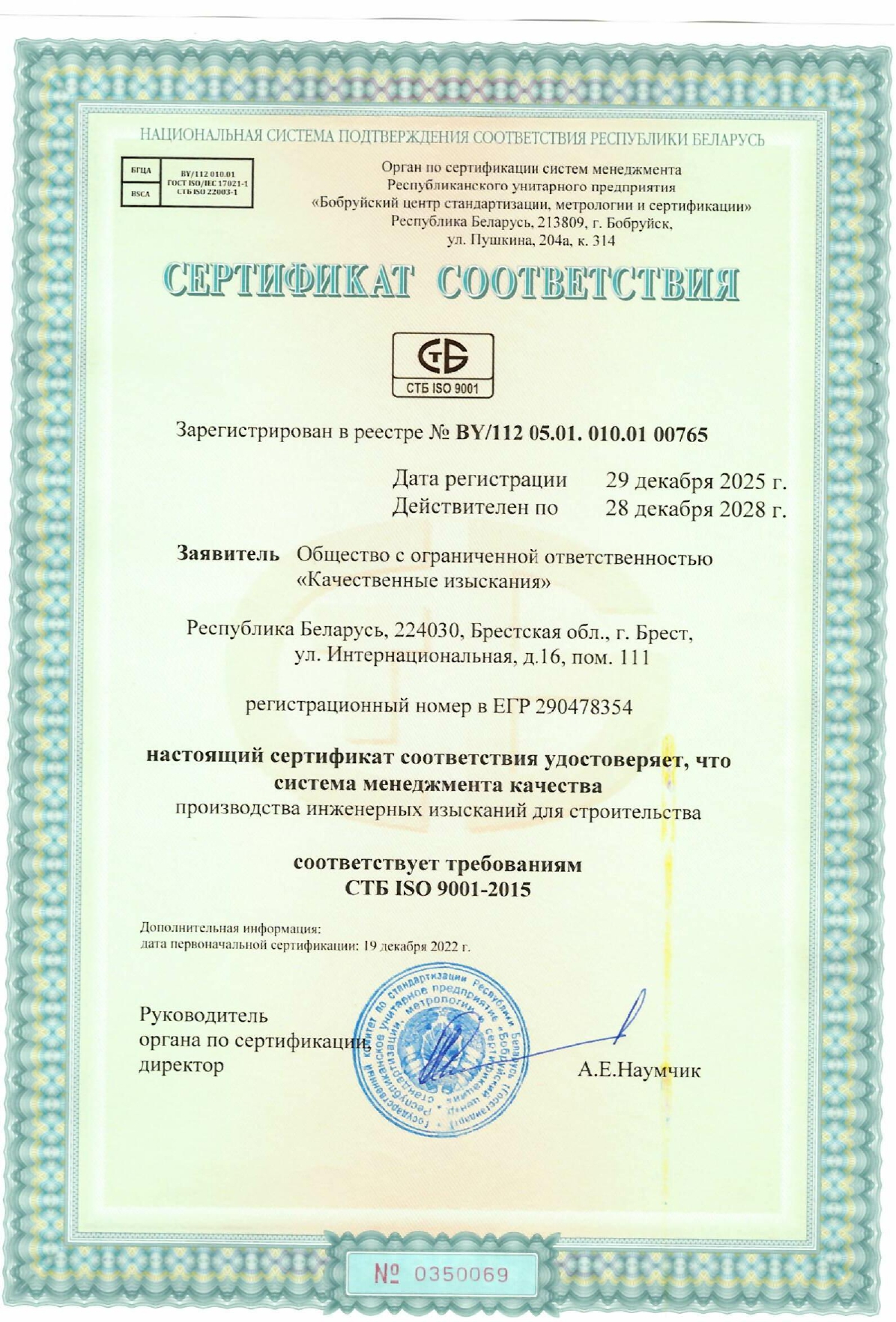 ООО "Качественные изыскания" получен сертификат соответствия ISO 9001